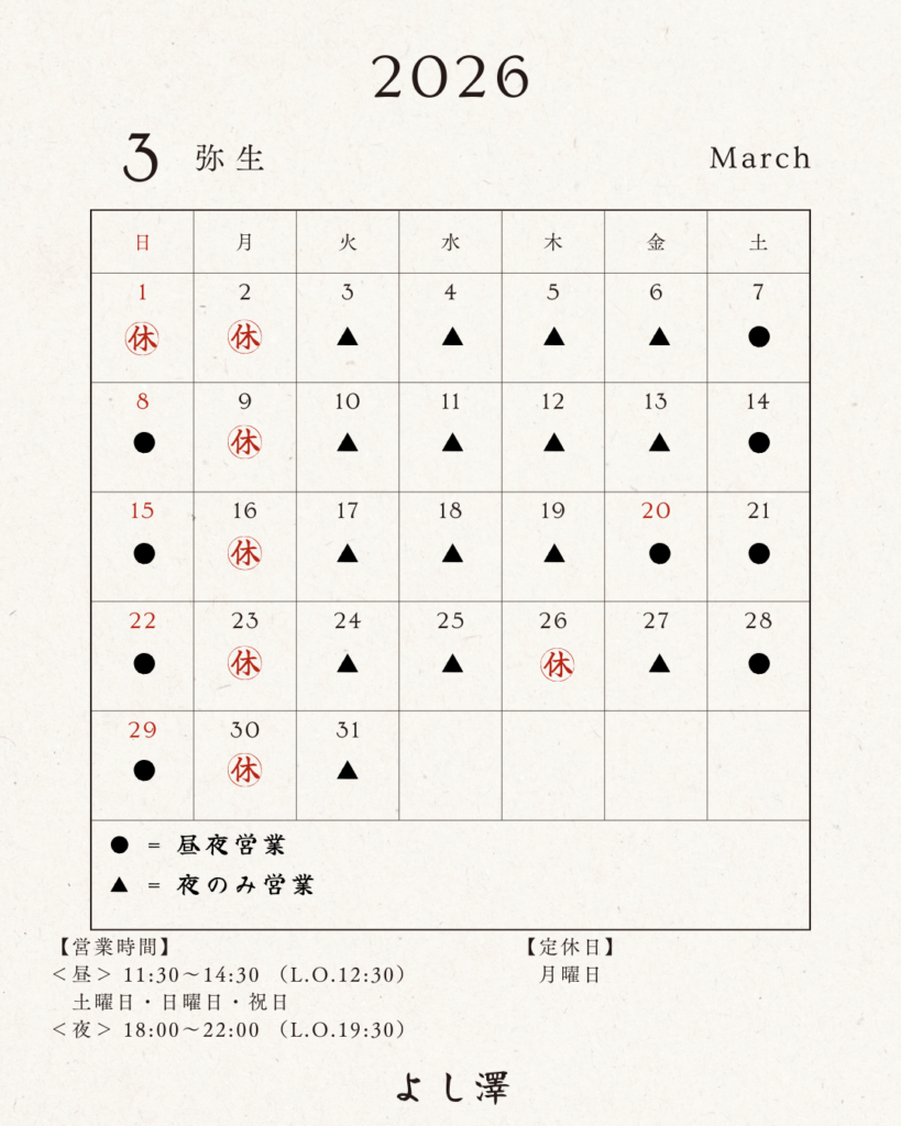 店舗情報 2026.02.13 2026年3月 営業日のお知らせ 春の訪れを感じる季節となりました。2026年3月の営業日をご案内申し上げます。 詳細は下記カレンダーをご確認ください。 旬の食材とともに、皆様をお迎えいたします。 公式ホームページ リニューアルのお知らせ